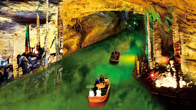 黃龍洞因相傳古代洞內(nèi)有黃龍藏身而得名,1983年經(jīng)當(dāng)?shù)?個青年民兵發(fā)現(xiàn)探明,1984 年正式對外開放。因洞內(nèi)擁有高闊的洞天、幽深的暗河、懸空的瀑布、上千個白玉池、數(shù)萬根石筍。